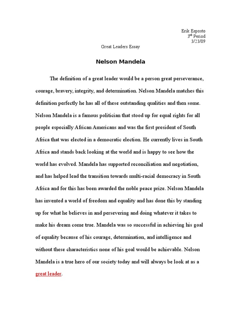5/12/ · Nelson Mandela is one of the greatest leaders in the world and the sets a good example of leadership. The purpose of this essay is to discuss leadership styles and what makes Nelson Mandela such a great leader according to the describing framework leadership style by Darling and Leffel () 8/10/ · August 10, by Essay Writer Alexander the Great is considered a legend by a majority of the people who knew who he was; he concurred so much land, ruled a vast kingdom, and he impacted history at such a young age. Although he was this great leader or legend, some people didn’t agree, he was a psychotic maniac, who had a big ego H ere is another leadership essay example that subtleties on the design of a paper. Most students neglect to score well in authority essays since they continue without a very much organized blueprint. Ensure you set up a psyche map or a fresh and brief diagram of your story from the start to remain inside the extent of the blogger.coms:
